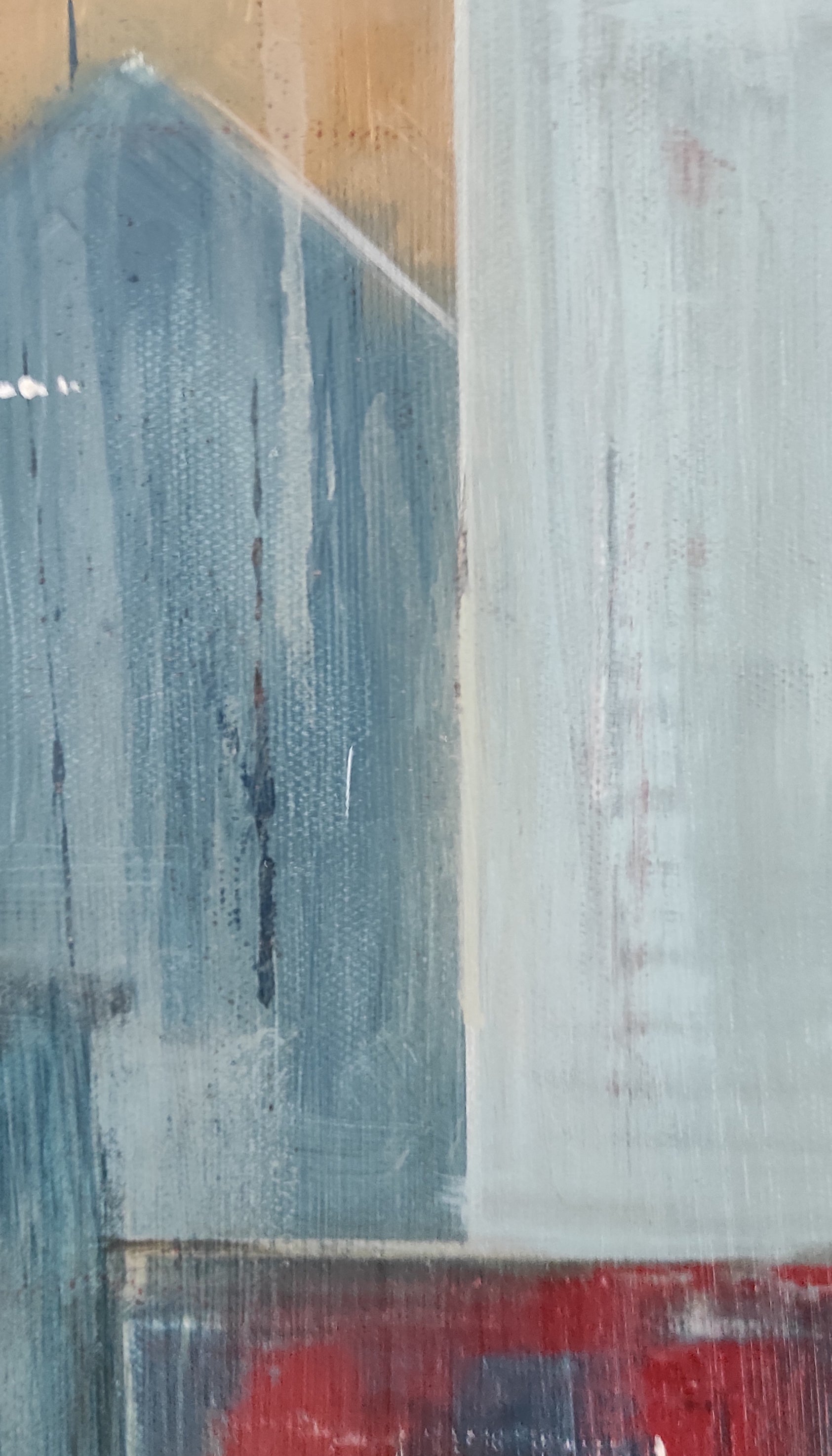 Toile originale graphique, scène urbaine stylisée. Les mystères de la ville, comme un labyrinthe de couleurs et de formes, envoutant et attirant. L'oeuil est happé par les différents chemins. Belle harmonie de couleurs.